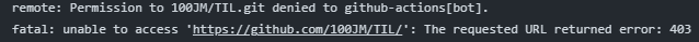 깃허브에 TIL 작성을 시작하면서 액션을 통해 README를 자동으로 작성해주는 방법이 있다길래 사용 해보는 도중 push를 했을때 아래와 같은 오류를 만났다.