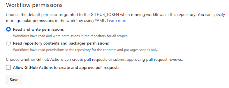 이리저리 검색해본 결과(권한, 토큰 문제 등) 여러 상황이 있는데 나같은 경우 Workflow 권한 문제였는데, 해당 레포지토리 - settings - actions(General) - Workflow permissions 부분 에서 Read and write 로 권한을 설정해주니 해결되었다!
